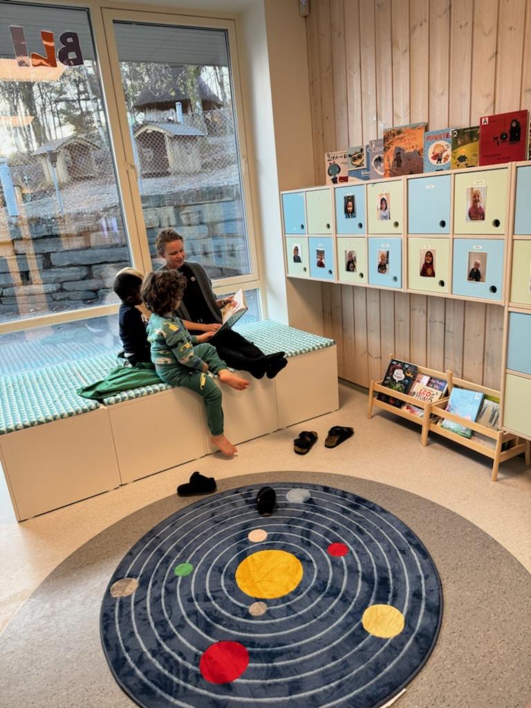 I Vadmyra barnehage jobber vi for å etablere en god kultur for språk og lesing, og vi har innredet flere lesekroker i barnehagen vår med bøker vi har lånt fra biblioteket i nærmiljøet. Vi har bøker på mange ulike språk som foreldre kan låne med hjem og lese sammen med barna. Målet er at alle foreldre skal kunne lese for barnet på sitt eget morsmål. Det er et tett samarbeid mellom barnehage og bibliotek.