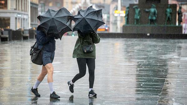 REGNBYEN BERGEN: Regn, vind og paraply for å søke ly over Torgallmenningen. Det kan til tider være mye klima i byen vår.