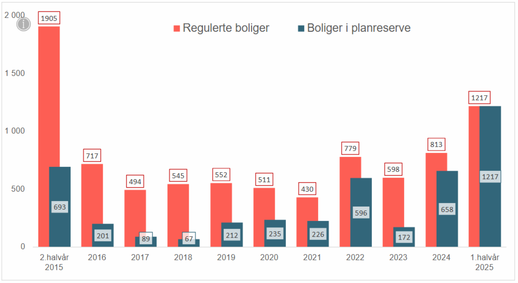 Mellom 2016 og 2024 ble det i gjennomsnitt regulert ca. 600 boliger per år. I 2025 har kommunen allerede regulert over 1200 boliger. Tallet ligger an til å stige til 1600 boliger før året er omme.
