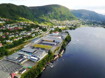 Storaneset nærmest til venstre viser dagens industriområde.Bebyggelse til venstre og grønne fjell bak.  Vågen til høyre