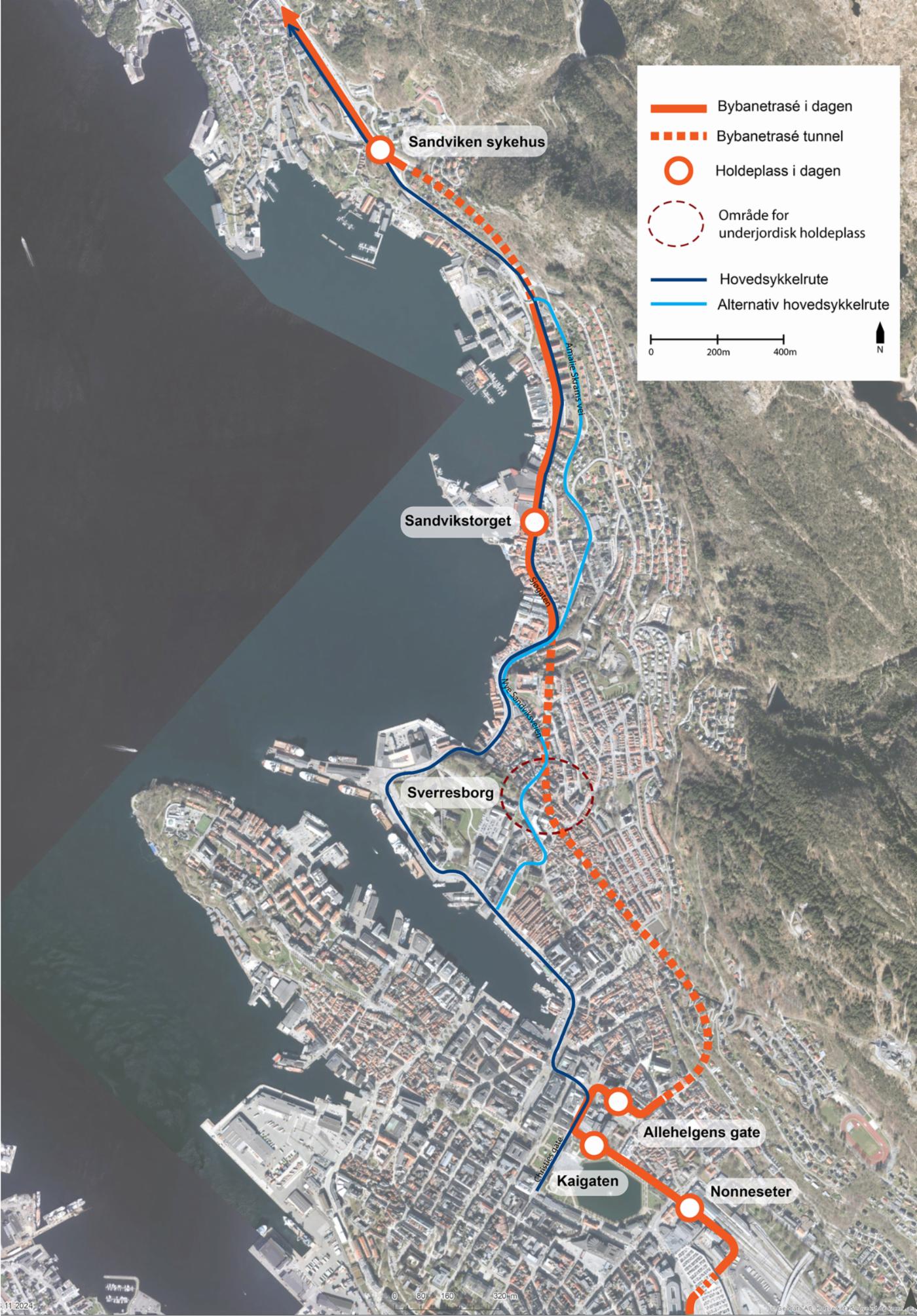 - Hovedsykkelruten skal kobles til ruten fra sør i Christies gate og gå gjennom sentrum og Sandviken.