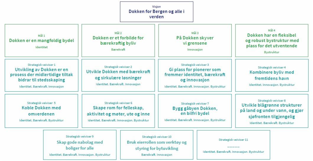 Strategien er bygget opp med en visjon for hva vi ønsker Dokken skal være i 2050, med fire mål som definerer visjonen og beskriver hva vi ønsker å oppnå. De elleve strategiske veiviserne beskriver hvordan målene skal nås, og gir rammer og retningslinjer for det videre arbeidet.
