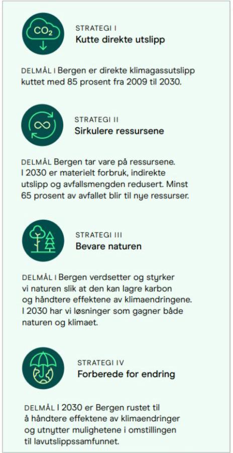 “Grønn strategi - Klimastrategi for Bergen 2022-2030” legger til grunn at vi må kutte både direkte utslipp i Bergen og indirekte utslipp som forbruket vårt skaper utenfor kommunen. Samtidig kobles naturkrisen og klimakrisen sammen, og forståelsen av klimatilpasning blir utvidet til å omfatte både risikoen knyttet til et klima i endring og risiko knyttet til selve omstillingen.
