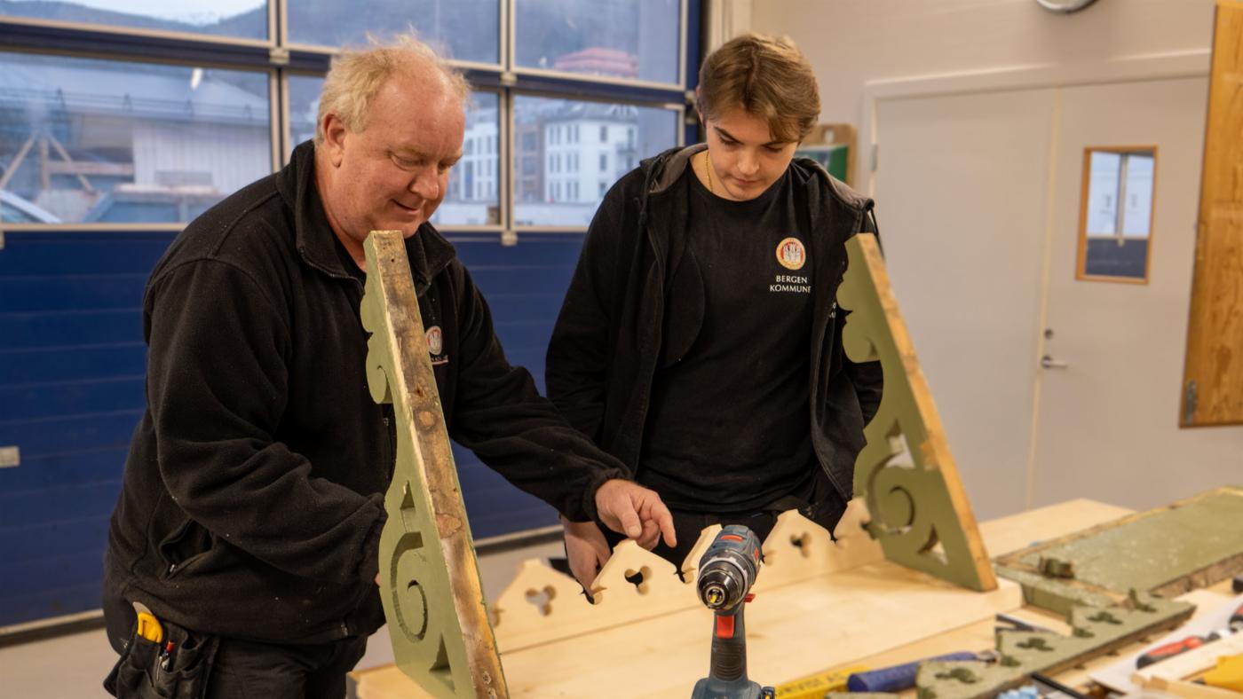 TROLDHAUGEN: Ronny Langhelle og Mathias Hamre Hansen i snekkeravdelingen i Etat for bygg og eiendom fikser vinduer og pynteornamenter fra Troldhaugen. Bystyret skal ta stilling til å overføre utredningsmidler til vedlikehold av komponisthjemmet.